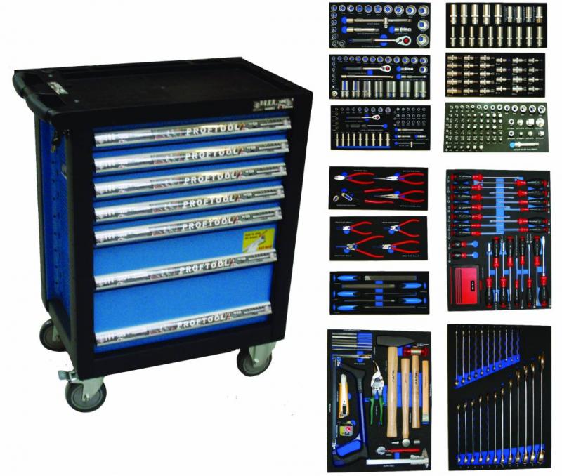 En robust vagn med 2 svängbara hjul varav ett är låsbart. 7 lådor som kan låsas genom ett centrallås med nyckel